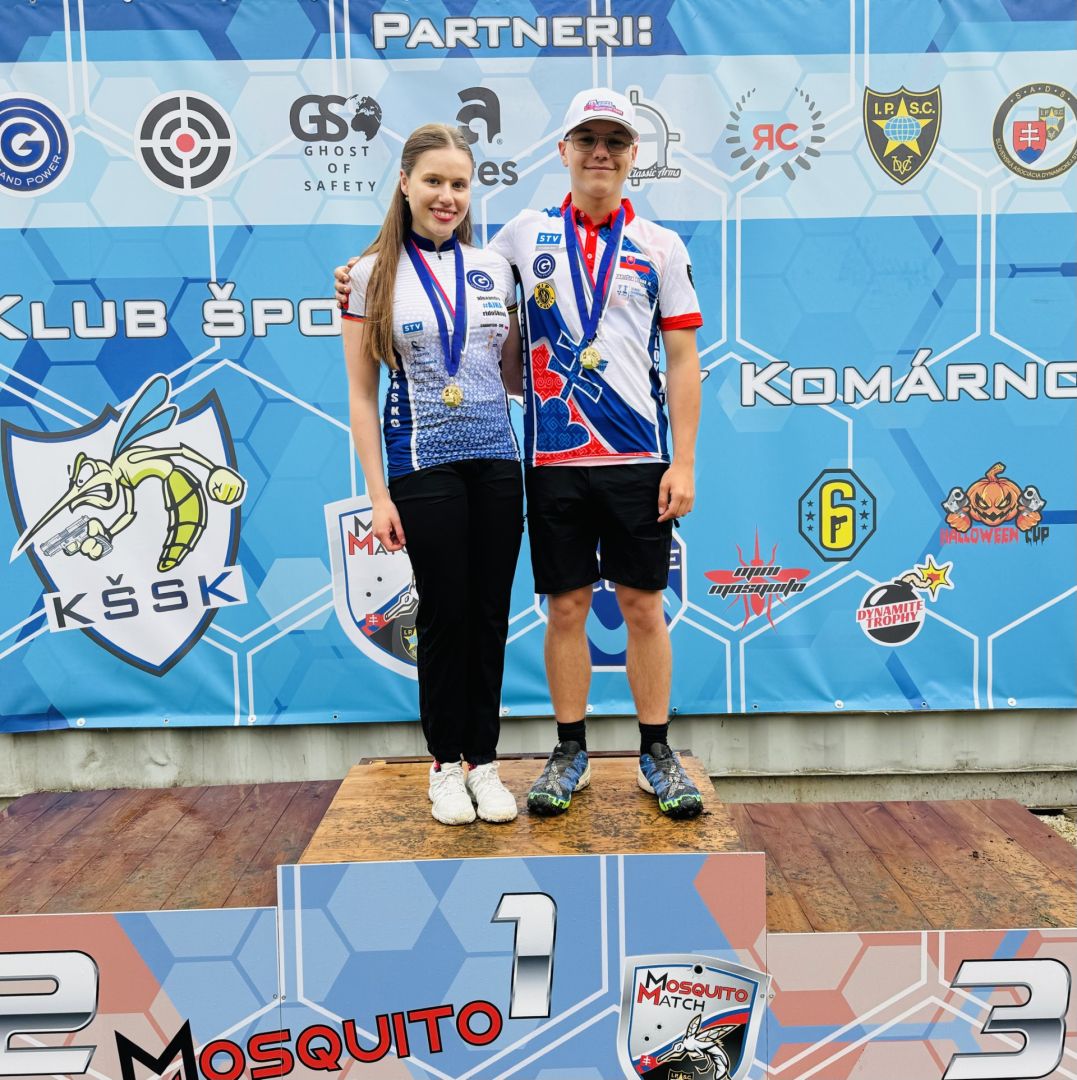 Naši firemní střelci zaznamenali další mimořádný úspěch! Alexandra Ridošková a František Blaha zvítězili ve svých kategoriích na mezinárodní soutěži Mosquito Match 2025, která se konala na střelnici Harčáš v Komárnu.